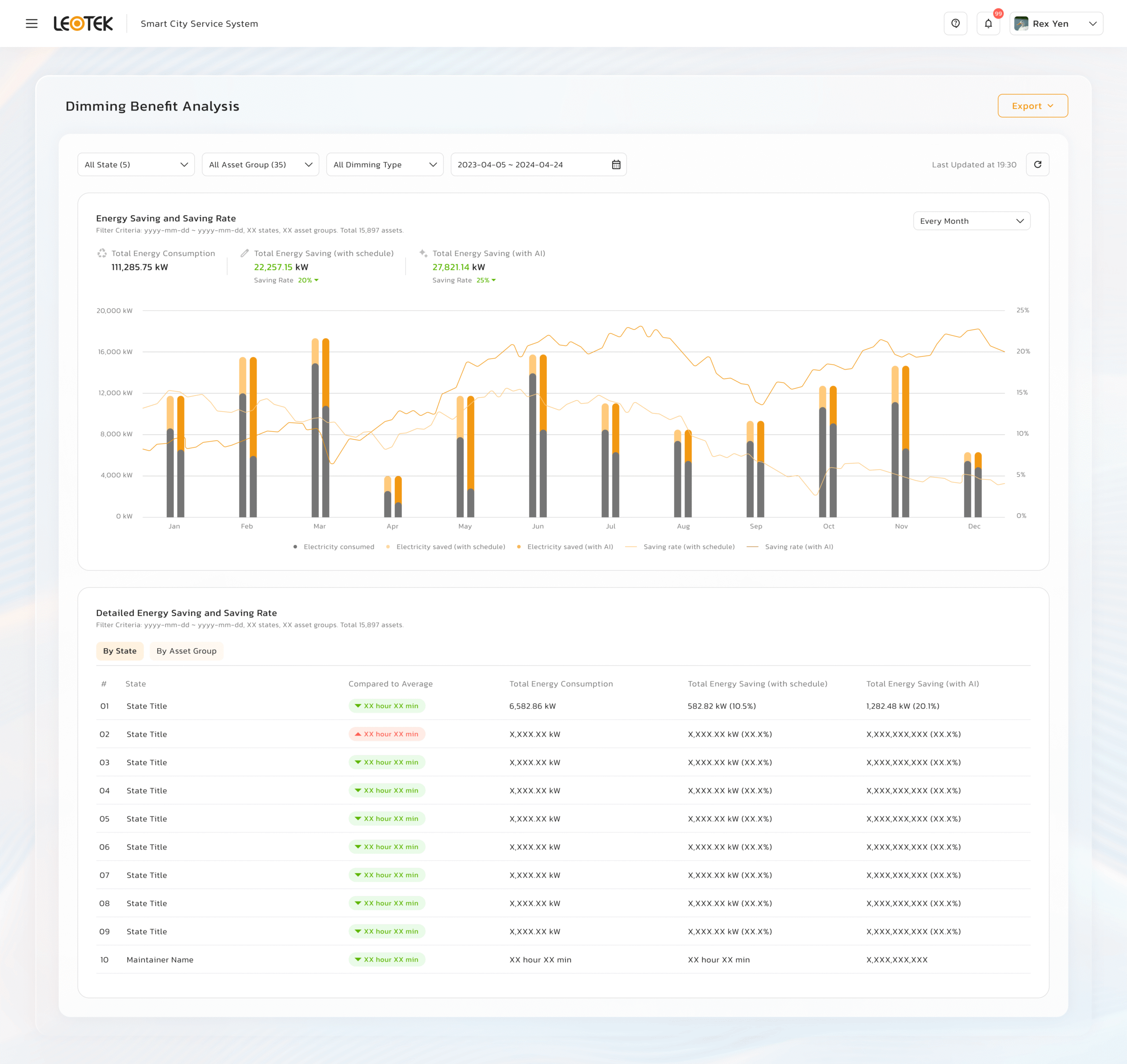 RenAI 提供關鍵指標以優化路燈照明。這些報告包括故障分析報告(用於優化硬體維護)、能耗報告(用於提高能效)和調光效益分析(用於節省能源和成本)。這些報告利用即時數據,提升營運效率和安全性。